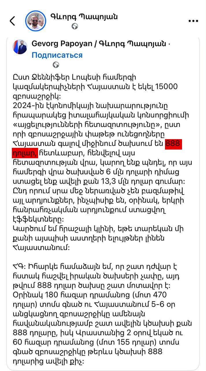 ՀՀ էկոնոմիկայի նախարար Գևորգ Պապոյանը վերջերս հայտարարեց, որ Ջենիֆեր Լոպեսի համերգի կապակցությամբ Հայաստան ժամանած զբոսաշրջիկները միջինում ծախսել են 888 դոլար։ Այս գնահատականը հանրային մեծ հետաքրքրություն ու քննարկում առաջացրեց։ «Ժողովուրդ» օրաթերթը ուսումնասիրել է նախարարության պաշտոնական տվյալներն ու պարզել՝ այդ թիվը, մեղմ ասած, խիստ չափազանցված է։