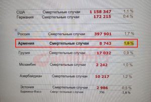Նախ նկատենք, որ հետխորհրդային երկրներում ամենաշատ մահացության դեպքերը հենց Հայաստանում են գրանցվել (էկրանանկարը դրված է): ՀՀ առողջապահության նախարարության պաշտոնական տվյալներով՝ ՔՈՎԻԴ-19-ի հետեւանքով 8746 մարդ է մահացել Հայաստանում: