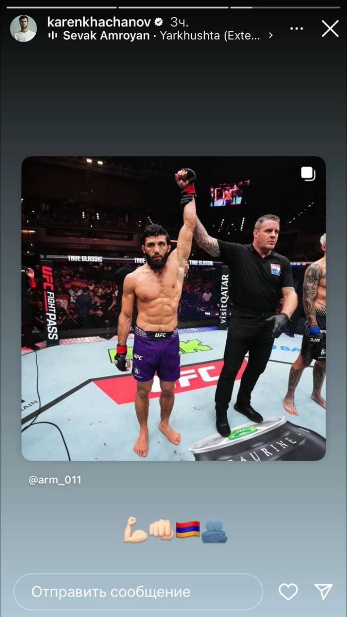 Աշխարհի 18-րդ ռակետ, ռուսաստանցի թենիսիստ Կարեն Խաչանովը սոցիալական ցանցերում արած գրառումով արձագանքել է խառը մենամարտերի թեթեւ քաշային կարգում UFC դասակարգման առաջին համար Արման Ծառուկյանի (Հայաստան) հաղթանակին դասակարգման 6-րդ համար, նորզելանդացի Դեն Հուքերի նկատմամբ Դոհայում անցկացված UFC Fight Night 264 մրցաշարում։
