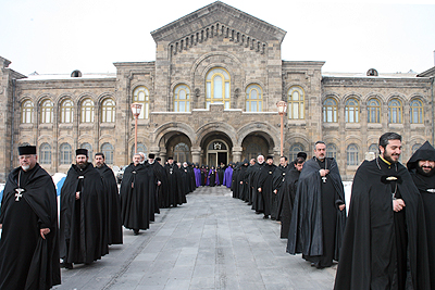 Ամենայն հայոց կաթողիկոս Գարեգին Բ–ն հոգևորականների ուղեկցությամբ Վեհարանից եկավ Մայր տաճար։