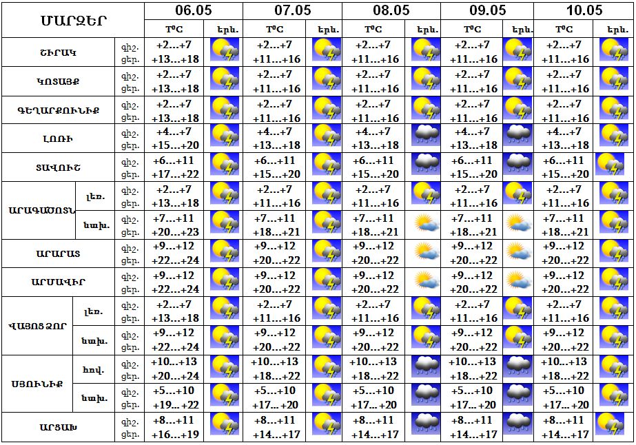 Մայիսի 6-ին, 7-ին, 10-ին՝ առավելապես օրվա երկրորդ և գիշերվա առաջին կեսերին սպասվում է կարճատև անձրև և ամպրոպ, ամպրոպի ժամանակ‵ քամու ուժգնացում‵ 15-17 մ/վ: Մայիսի 8-9-ի երեկոյան ժամերին հնարավոր է ամպրոպ, անձրևի հավանականությունը փոքր է: