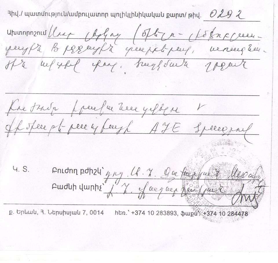 2016թ.-ի մայիս ամսին նրա մոտ ախտորոշվել է սուր լեյկոզ հիվանդությունը և այժմ գտնվում է ք.Երևան Ռ. Հ. Յոլյանի անվան արյունաբանական կենտրոնում:
