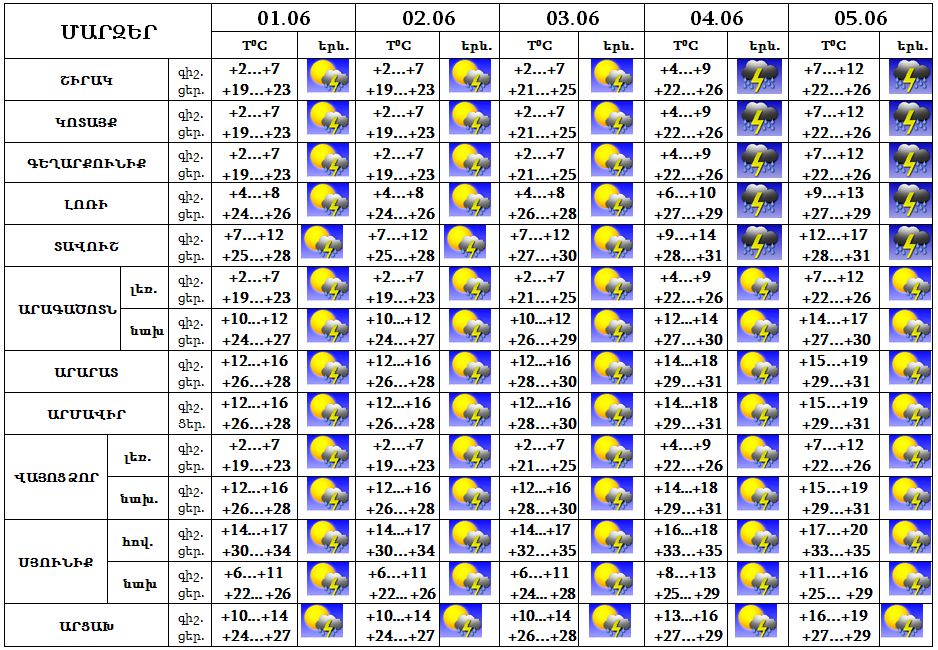 Հունիսի 1-5-ը` կեսօրից հետո և գիշերվա առաջին կեսին, սպասվում է անձրև և ամպրոպ, ամպրոպի ժամանակ‵ քամու ուժգնացում‵ 18-23 մ/վ արագությամբ: