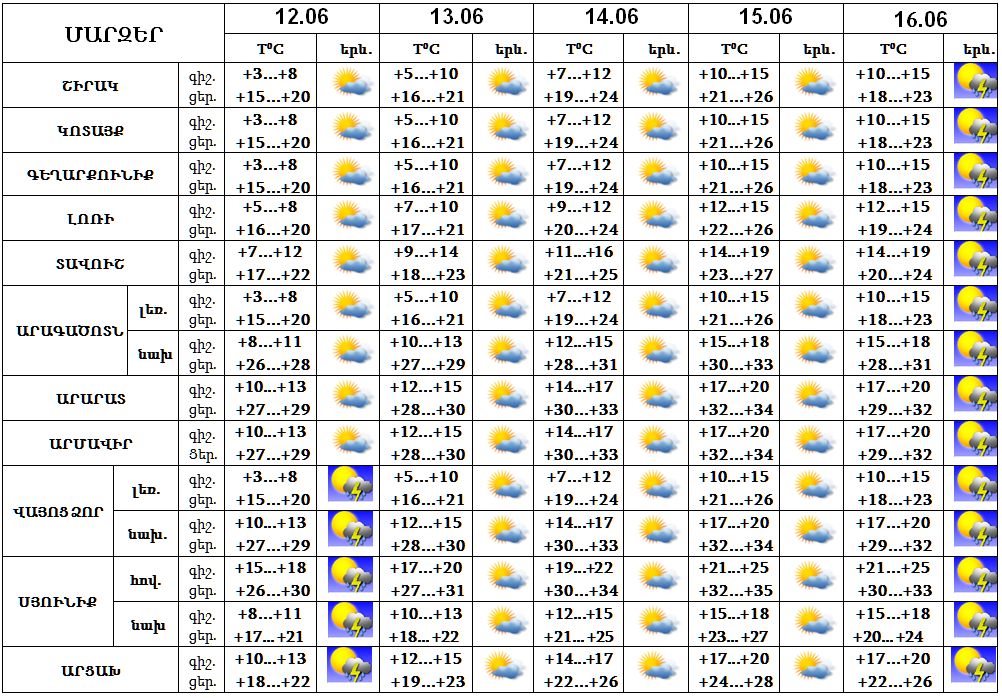 Հունիսի 12-ին‵ Վայոց Ձորում և Սյունիքում, 16-ին շրջանների զգալի մասում կեսօրից հետո և գիշերվա առաջին կեսին սպասվում է կարճատև անձրև և ամպրոպ, առանձին հատվածներում հնարավոր է կարկուտ: