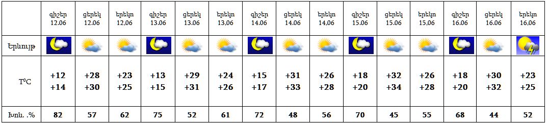Հունիսի 16-ին‵ երեկոյան ժամերին սպասվում է անձրև և ամպրոպ, ամպրոպի ժամանակ սպասվում է քամու ուժգնացում‵ 15-20մ/վրկ արագությամբ: