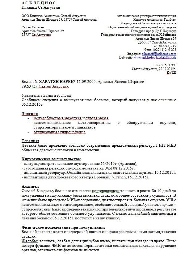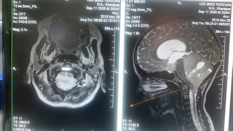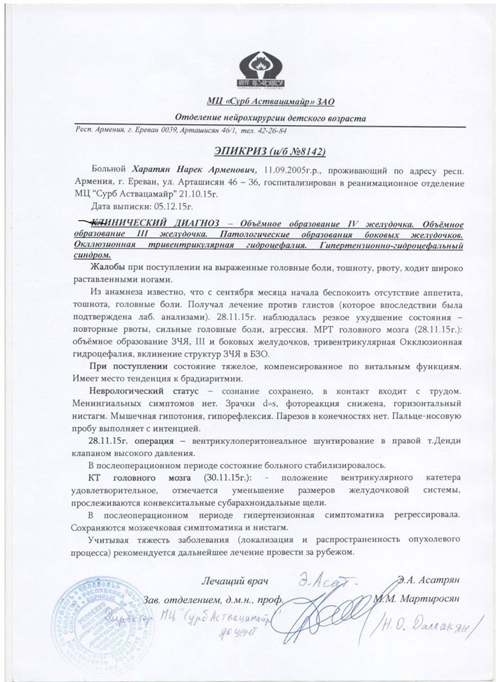 Նարեկ Խառատյանը 10 տարեկան է: Նա գերազանց սովորում է Երևանի թիվ 38 դպրոցում: 2015թ-ի նոյեմբերին նրա մոտ հայտնաբերվել է ուղեղի նորագոյացություն (մեդուլլոբլաստոմա), IV փուլ: Բժիշկները կանխատեսել էին նրան ապրելու համար շուրջ մեկ ամիս: Դեկտեմբերի 5-ին բժիշկների խորհուրդով նրան տեղափոխել ենք Գերմանիա, որտեղ վիրահատվելուց հետո պարզվեց, որ ուռուցքը ենթարկվում է քիմիայի: Երկու կուրս քիմիաթերապիայից հետո արդյունքը մեծ էր՝ հաջորդ վիրահատության կարիքը չկար: Ճառագայթման կուրսի սկզբում ութ ամիս լռելուց հետո նա սկսել է խոսել: Արտասանում է բառեր, սակայն դեռ չի քայլում: Բուժումը ավարտելու համար նշանակված է քիմիաթերապիայի ևս երկու կուրս: Սակայն գումարները մեծ են, շարունակելու համար հարկավոր է դեռ 51 000 եվրո: