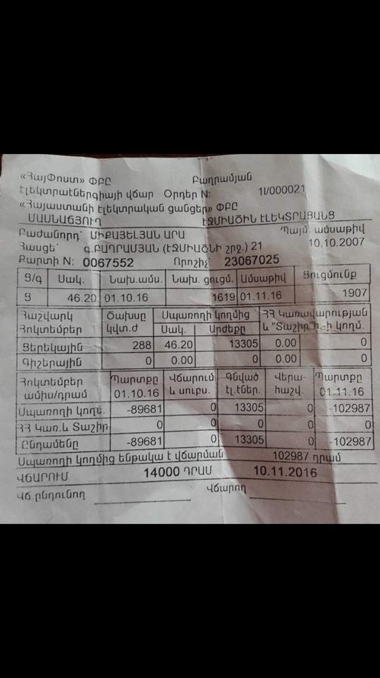 Ընկերներ ջան, 3 անչափահաս երեխա ունեցող ընտանիքի հոսանքի կտրոնն է, ամիսների պարտք ունեն, եթե գոնե կեսը չվճարվի, կհոսանքազրկվեն: