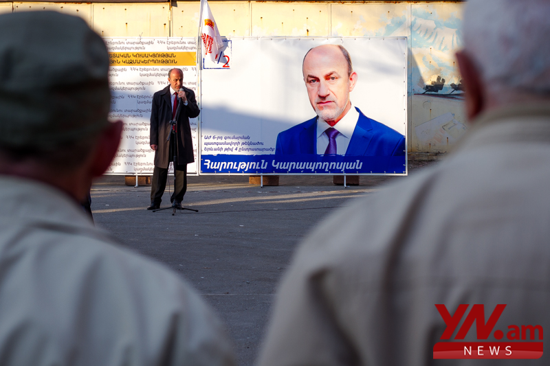 Երևանի Կենտրոն, Նորք-Մարաշ, Էրեբունի, Նուբարաշեն վարչական շրջաններն ընդգրկող թիվ 4 ընտրատարածքում «ՀՀԿ» ցուցակով առաջադրված թեկնածու, անկուսակցական Հարություն Կարապողոսյանը, բնակիչների հետ հերթական անգամ հանդիպեց Էրեբունի զանգվածի Խաղաղ Դոնի բակային տարածքներից մեկում: «ԱԺ ուզում եմ գնալ ձեր «դեմքով», չեմ եկել մեծ-մեծ խոստումներ տալու, ես իրատես եմ, այդ իսկ պատճառով՝ շատ թեկնածուների նման չեմ ասում, որ 80 տոկոսով բարձրացնելու եմ թոշակները և այլն»,- հանդիպմանը հայտարարել է Հարություն Կարապողոսյանը: Թեկնածուի խոսքերով, ի տարբերություն շատ քաղաքական գործիչների, ինքն ասում է այն, ինչը կարող է անել»:
