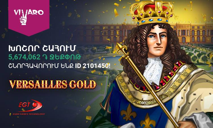 Հերթական խոշոր շահումն է արձանագրվել Վիվառոյում: Կազինոյի Versailles Gold խաղում շահումը գրանցվել է ապրիլի 30-ին, իսկ մասնակցի կատարած խաղադրույքը կազմել է ընդամենը 150 դրամ: