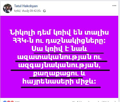Հիշում ե՞ք, սրանից առաջ էլ «Փաշինյանի կադրերից» մեկի՝ Արարատ Միրզոյանի (արդեն նախկին) խոսնակ Կարպիս Փաշոյանը հանրությունը բաժանեց՝ «բանականություն ունեցողների» և «ռազմահայրենասիրական շիզոֆրենիկների», դրանից հետո, էդ ակտի հետ կապ ունեցող մի այլ կարկառուն դեմք՝ Սիվիլթասից Թաթուլը Հակոբյան, հայտարարեց, որ սա պայքար է «ազատականների և ազգայնականների, քաղաքացիների և հայրենասերների միջև...»։